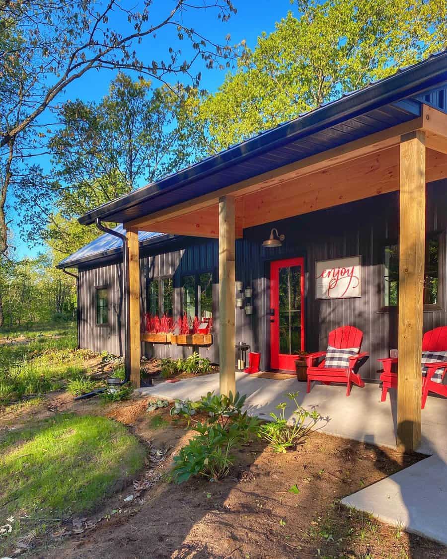 Adding potted succulents or cacti can soften the starkness of the black and introduce a touch of greenery for a balanced and captivating porch that captures the essence of modern industrial design.
