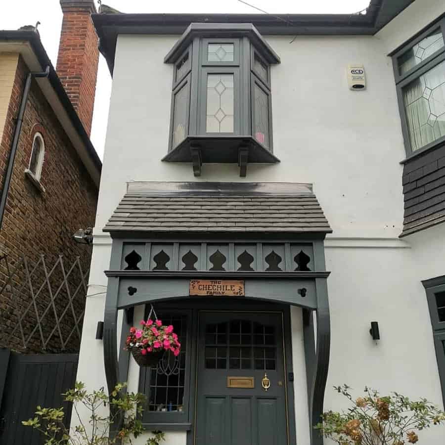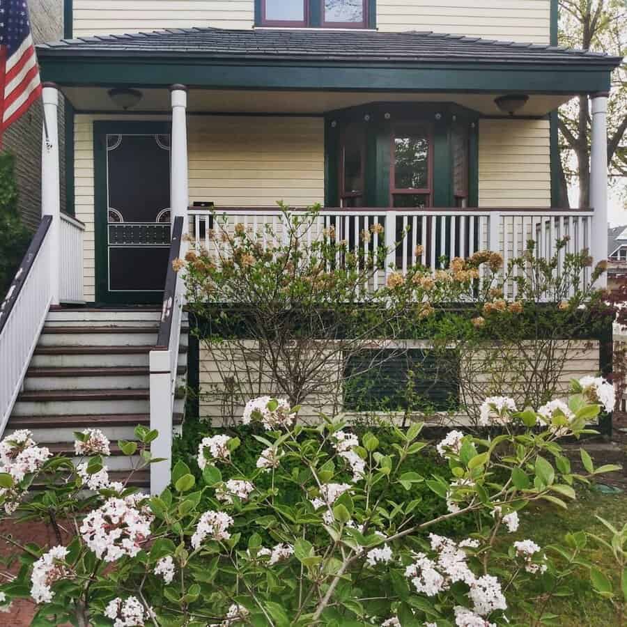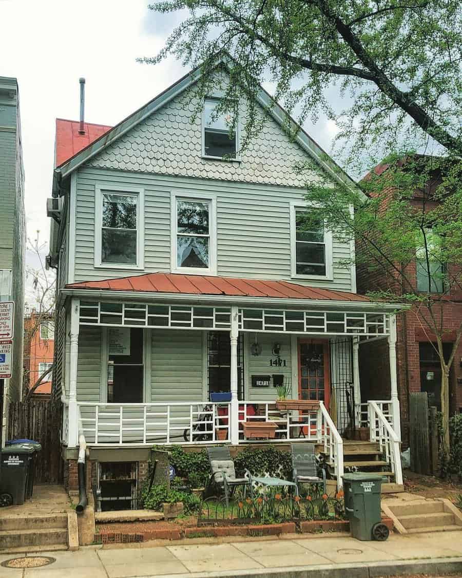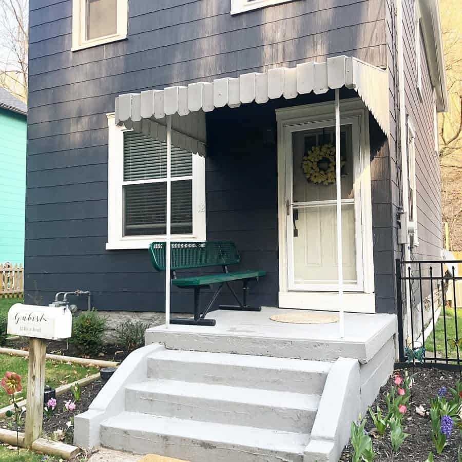 Light colors create a sense of openness and airiness, making the narrow space feel more expansive. To complete the look, add some potted plants or hanging baskets to your porch, which not only complement the light colors but also add a touch of nature to your outdoor area, creating a welcoming and visually appealing atmosphere.