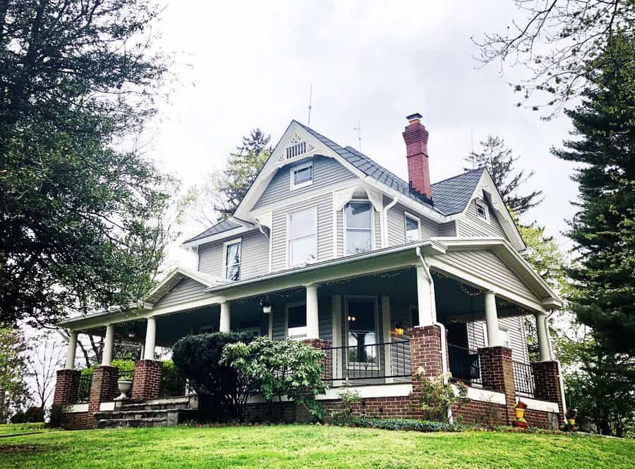 A porch is attached to the home. It’s level with the home’s exterior doors and may be built up off the ground. It usually has a roof and railings that also connect to the home’s main structure. A porch is usually along the front of the house, but it can also be located behind it. Some farmhouses have a wraparound porch that goes around the entire home.