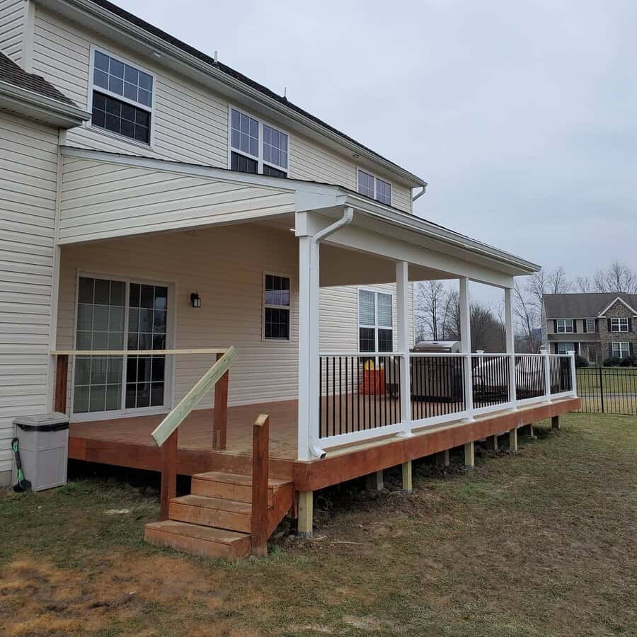 Deck: A deck is a raised horizontal platform supported by beams or columns. It’s usually made of wood or a composite decking material. A deck doesn’t have a roof or walls, but must have a railing if it’s more than two feet above the ground.