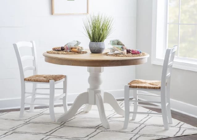 Unlike smaller round tables, this one can comfortably accommodate up to six people. The 48-inch diameter gives you plenty of room for place settings, serving dishes, and a centerpiece. Embrace the rich dark wood coloring with chairs that also have it. For softness, choose chairs that are upholstered with fabric. This table is not just good looks, though; the birchwood construction elevates the quality of this table.