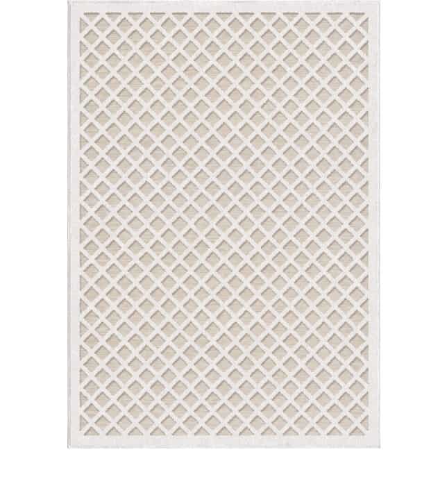 This contemporary rug is family and pet friendly thanks to its polypropylene construction. It’s easy to clean with strong detergents and bleach. The synthetic fibers are soft and durable with a low pile lattice pattern.