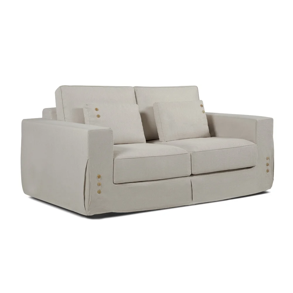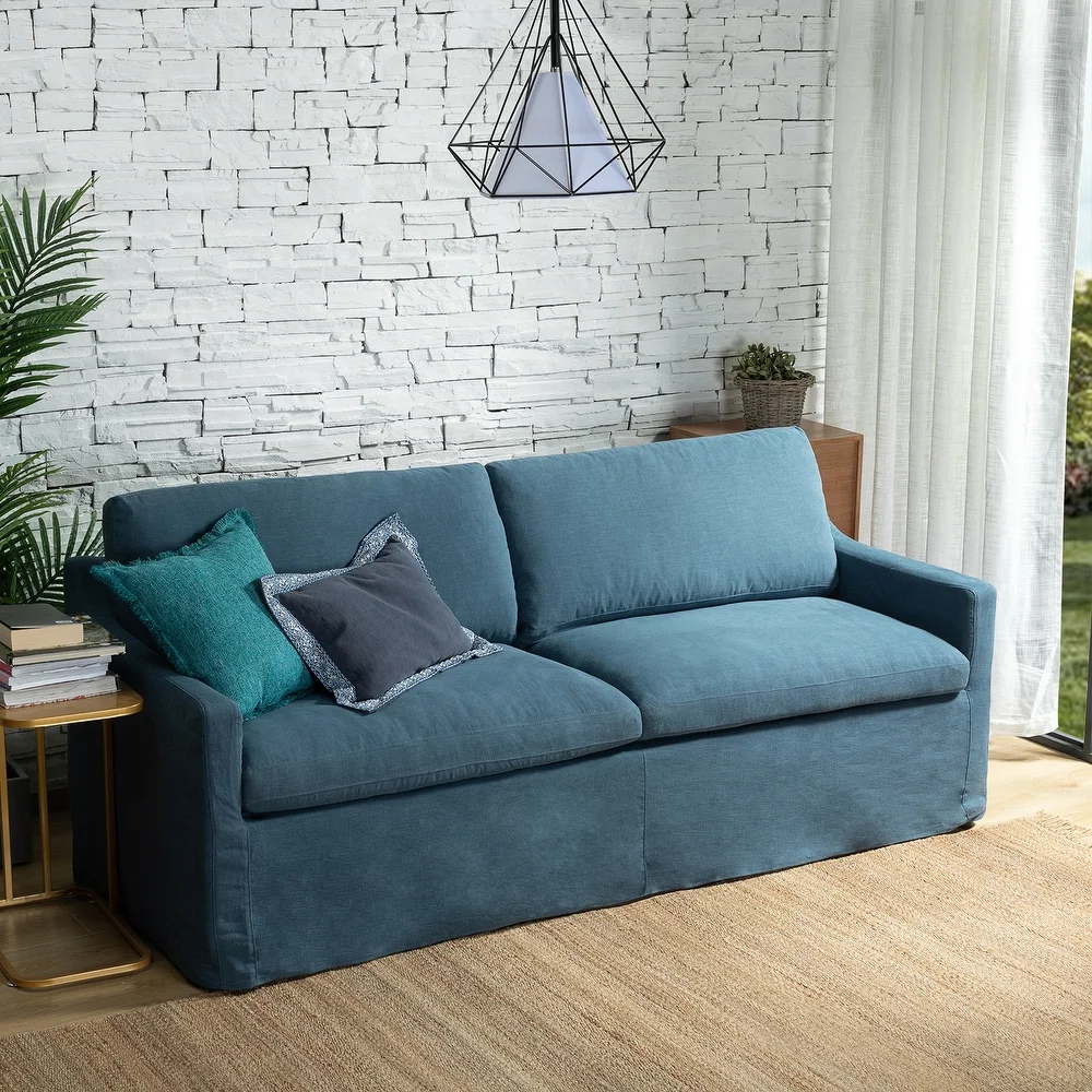 This may be a slipcover sofa, but you would never know it from the sharp design of the corners and seat cushions. This sofa has a bit of extra design style that you don’t usually see in slip covered sofas. Accenting the front of the sofa and the two throw pillows are decorative colored wooden buttons. This gives your sofa a subtle decorative touch. Caring for this sofa is simple, thanks to the removable slipcover. Take it off and throw it in the washing machine, making it perfect for active and high traffic living rooms. The fill on this sofa is more durable than most, with silicone fiber and covered with a silicone fiber mat. The tall back cushions give your body plenty of support for the ultimate in lounging comfort. The sharp square and simple design of this sofa give it a modern feel while also helping it blend into a variety of interior design styles.