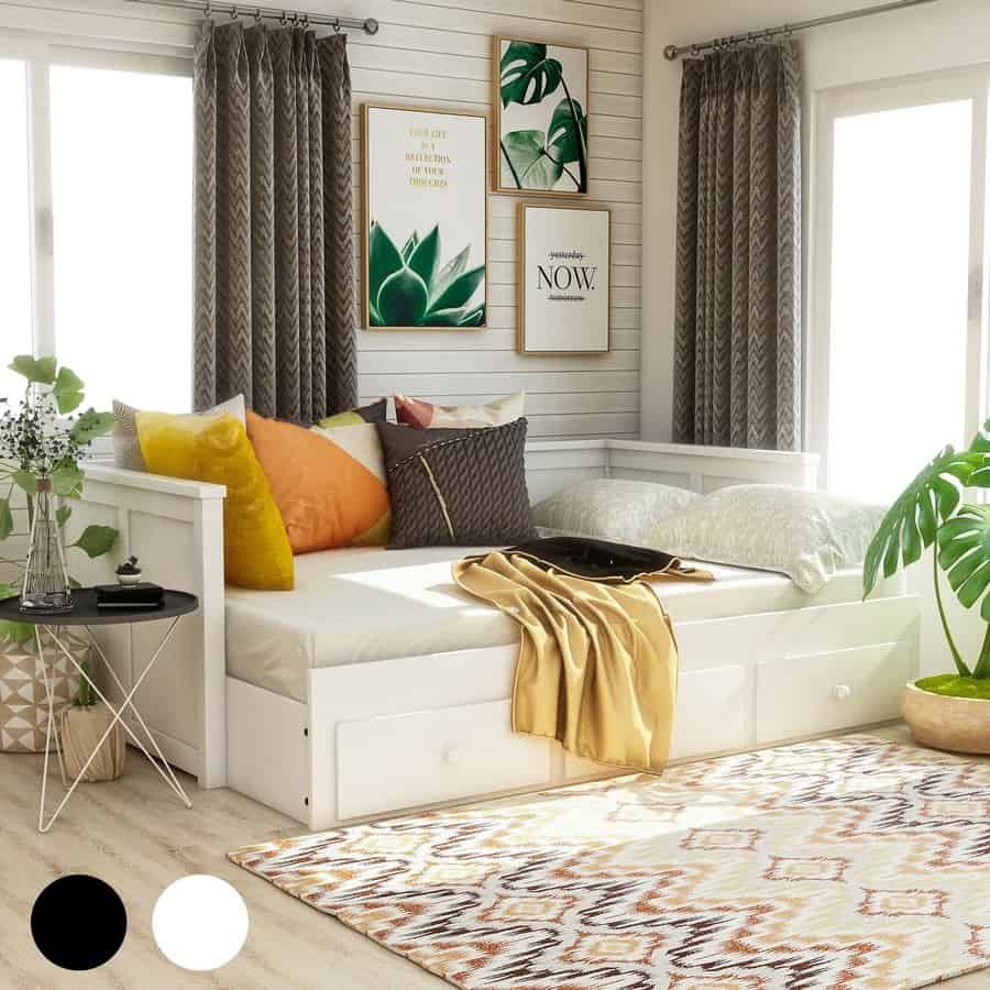 This beautiful daybed is the perfect addition to your guest bedroom. Unlike larger wooden storage beds, this daybed is compact enough to neatly fit into a room that you use for multiple purposes. It also has three large drawers underneath to give you plenty of additional storage space. Arrange decorative accents and throw pillows along the back to use the daybed as a sofa. The frame comes in black or white, both neutrals that are perfect for any interior design style. Using the storage underneath is simple, thanks to the easy-glide mechanisms for the drawers. The drawers are lined with wood veneer, giving them a clean look. There is plenty of space for storing clothes, extra linens, or anything else. The simple wood drawer pulls, and slat beadboard finish on the frame give this daybed a country cottage feel that is simple yet chic. This daybed does not come with a mattress, so you will need to purchase a full-size mattress for it.