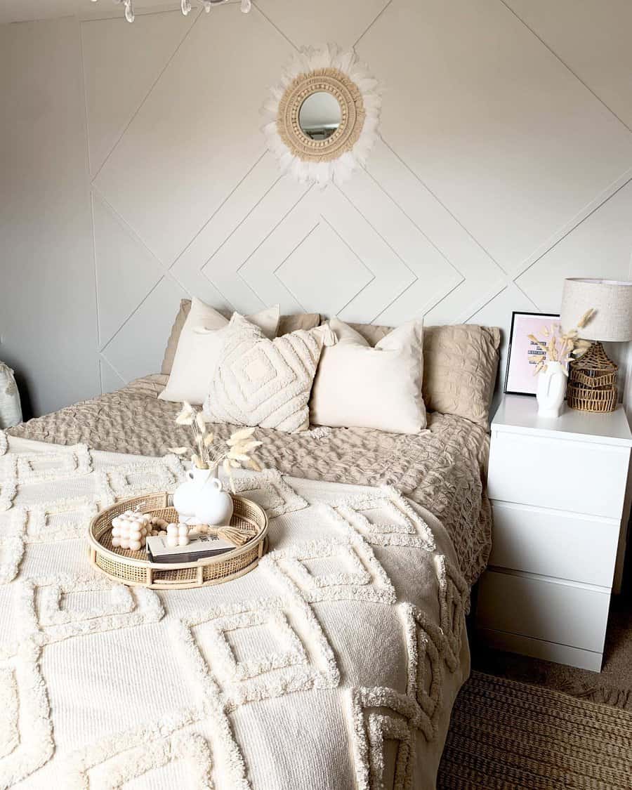A neutral background is a helpful clean slate for building boho bedroom ideas. Splashes of bold color are appropriate in a boho bedroom space, but they aren’t necessary if you prefer the calming vibe of a totally neutral room.