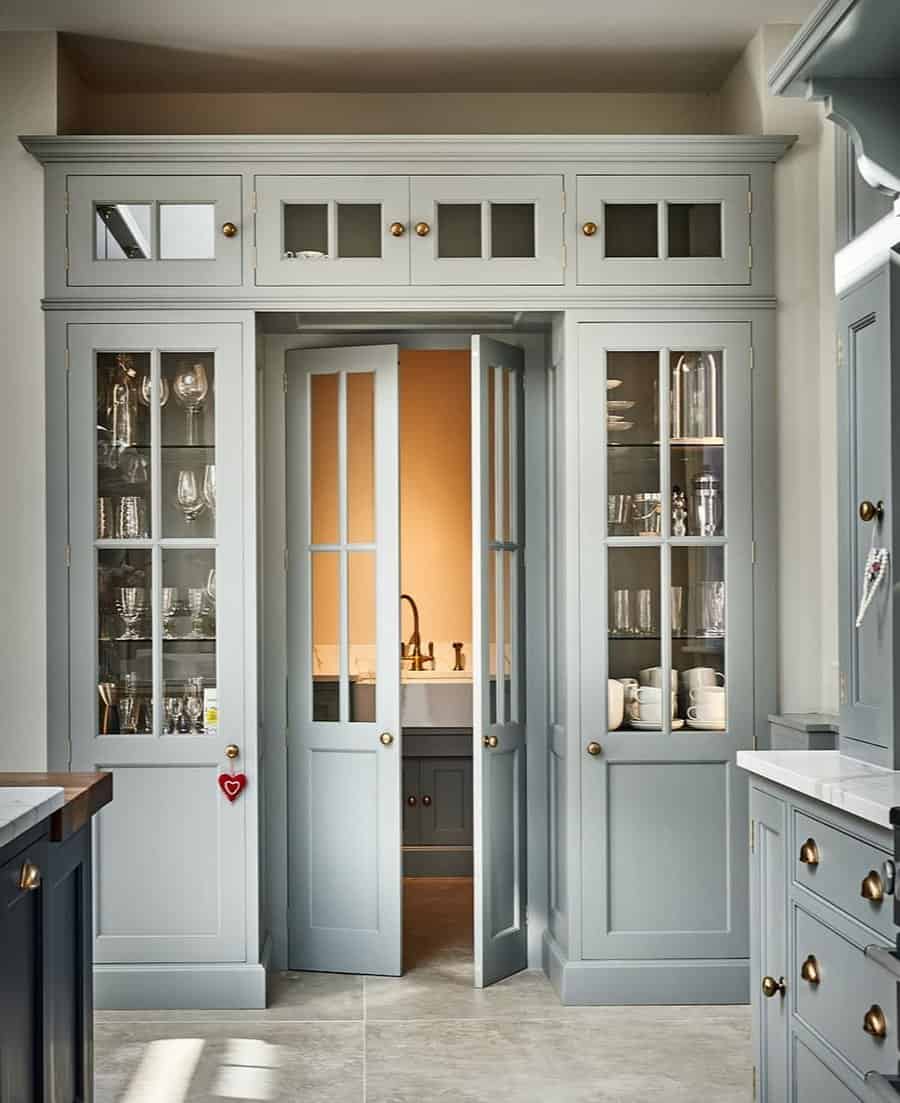 You could keep the design minimal with a frameless setup or give it a bit of structure with a black frame on it. Be aware that a glass door on your pantry may not be a good option if you have little ones living in your home. You will have to accept the smear marks and fingerprints or constantly clean the door.