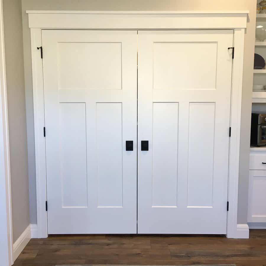 A sliding barn door is a hallmark design element of the farmhouse style. These doors aren’t great if you want to create privacy, but they work just fine for a pantry. Barn doors are similar to pocket sliding doors, but they sit on the outside of the wall.