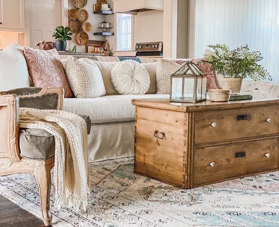 Anything made of reclaimed wood will fit into your rustic farmhouse decorating ideas. Whether it’s a vintage trunk turned into a living room coffee table or a distressed-finish wood window frame hung over the porch rail, these highly-textured accents are the epitome of rustic decor.